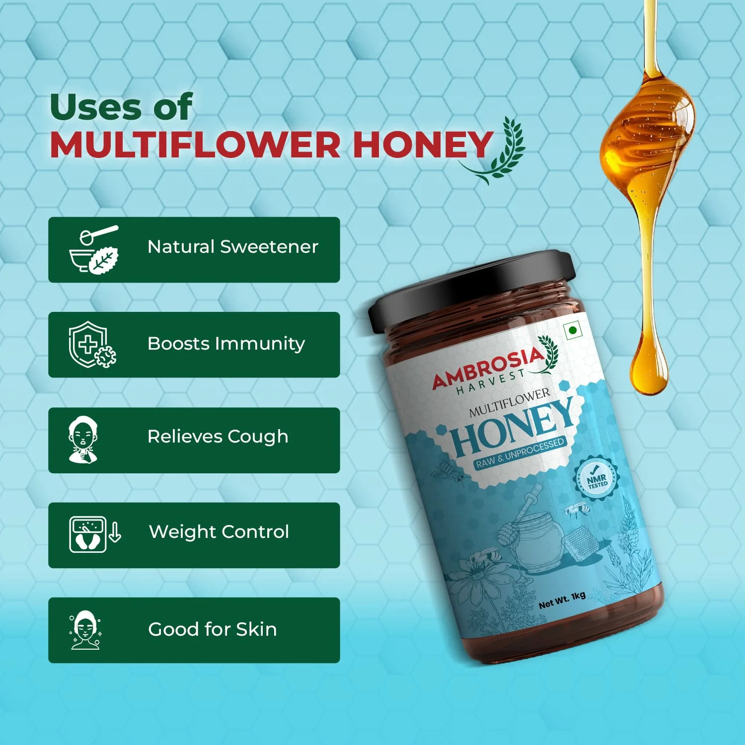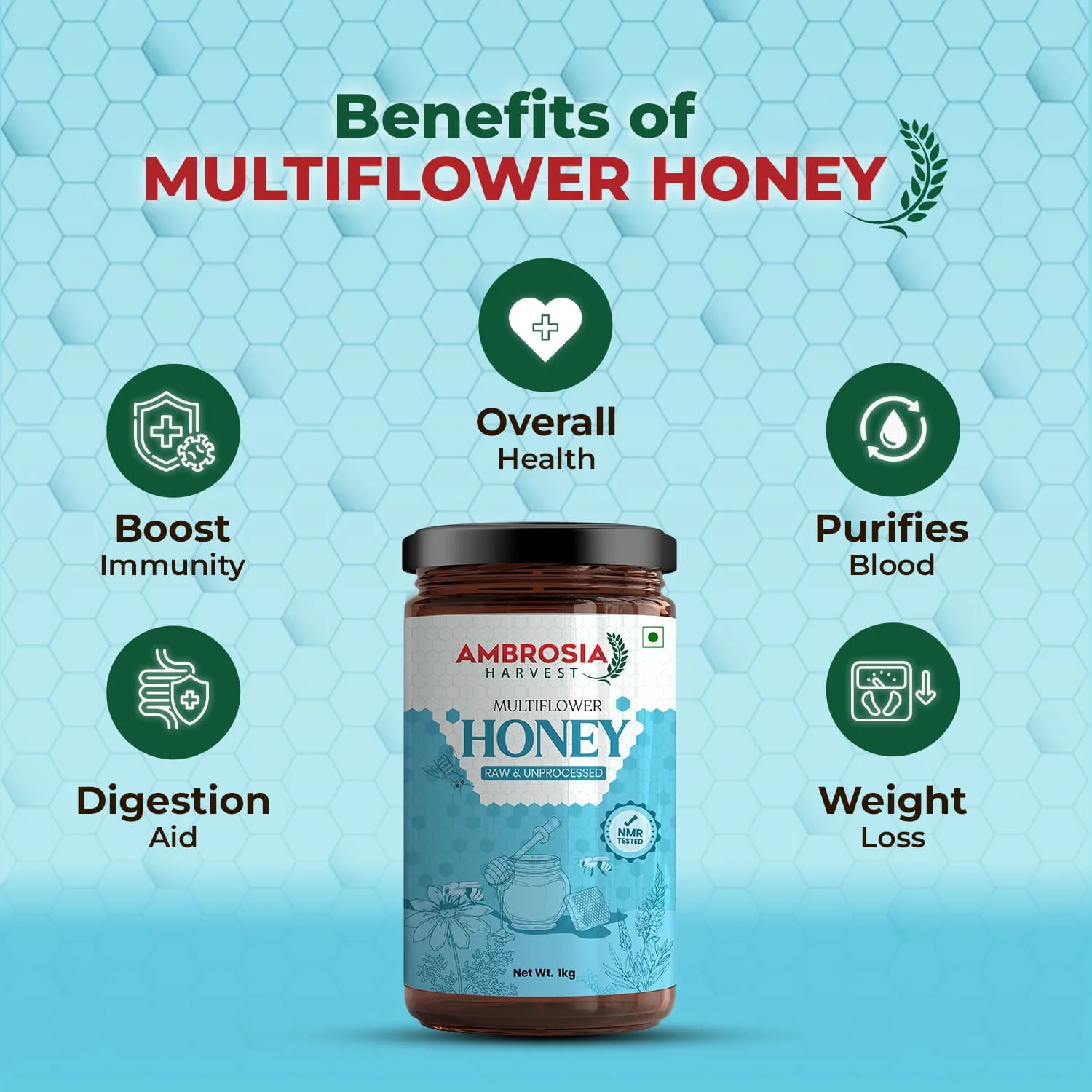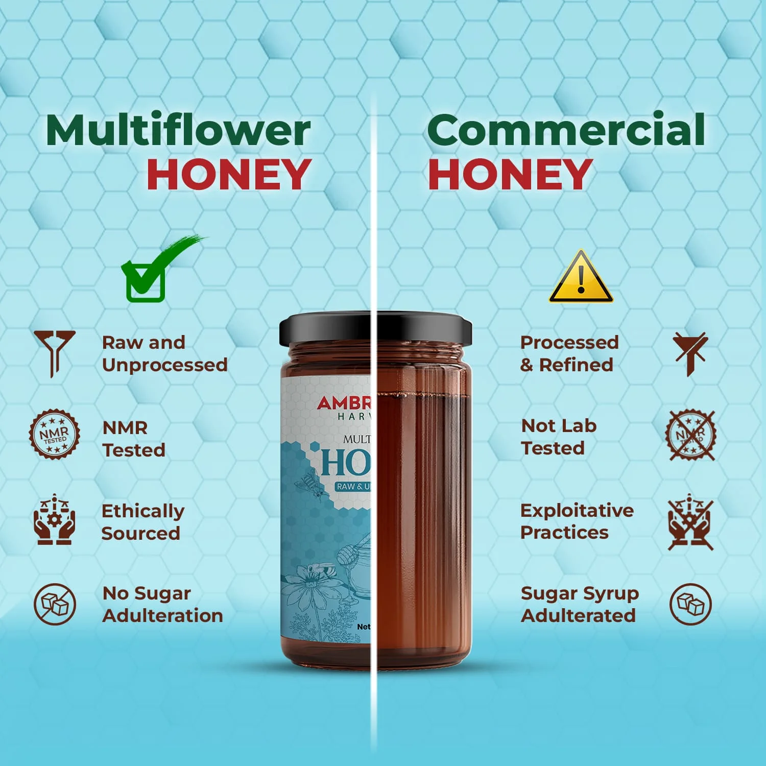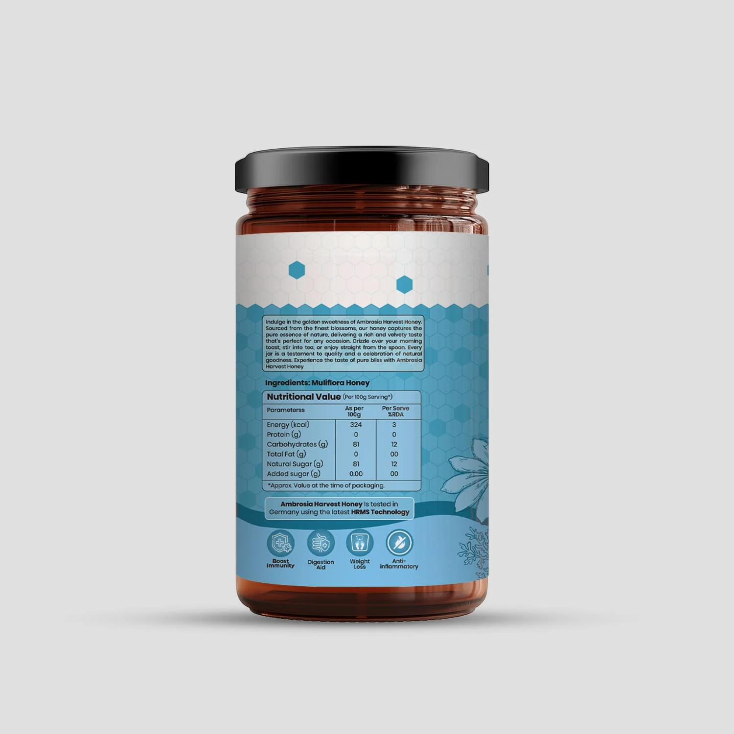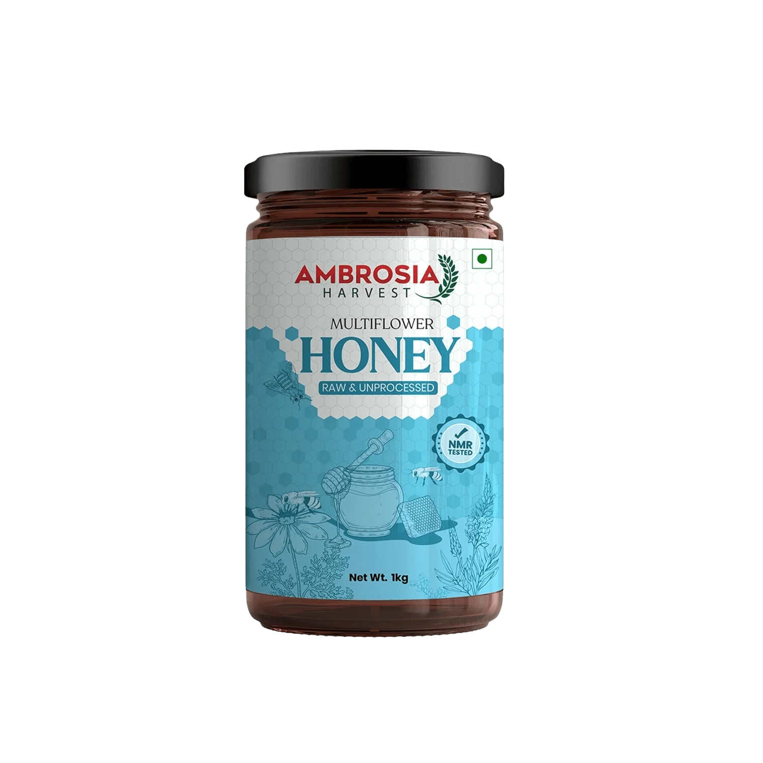 🌿Introducing the golden essence of nature with Ambrosia Harvest – Multiflower Honey 1kg Glass Bottle Pack. A premium blend of nectar sourced from diverse floral landscapes. This raw and unprocessed treasure is unfiltered, unheated, and unpasteurized, preserving its essential nutrients and authentic taste. Whether you’re seeking natural honey for wellness, cooking, or daily nourishment, this multi flora natural honey delivers purity in every spoonful. 🌿Tested rigorously through NMR and HRMS protocols, our lab-tested honey guarantees zero additives and no added sugar, making it a trusted choice for health-conscious consumers. Packed in a sturdy glass bottle to maintain freshness and integrity, this original honey is your go-to for a wholesome lifestyle.